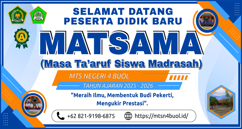 Peserta didik baru yang diterima di MTs Negeri 4 Buol tahun pelajaran 2025-2026, kembali menjalani kegiatan pra Matsama (Masa Ta'aruf Siswa Madrasah) Peserta didik baru Madrasah Tsanawiyah Negeri 4 Buol mengikuti kegiatan Masa Ta’aruf Siswa Madrasah (Pra matsama). Kegiatan pra matsama adalah berbagai kegiatan yang dilakukan sebelum Matsama. Peserta didik yang baru masuk madrasah akan diberikan pengenalan program, sarana prasarana madrasah, cara belajar, penanaman konsep pengenalan diri, dan pembinaan awal budaya kekhasan madrasah. Pra Matsama termasuk kegiatan transisi agar peserta didik benar-benar siap secara mental untuk mengikuti proses pembelajaran di lingkungan yang baru. Oleh karena itu madrasah perlu mengisi kegiatan pengenalan yang bersifat edukatif, kreatif, dan menyenangkan bagi peserta didik.